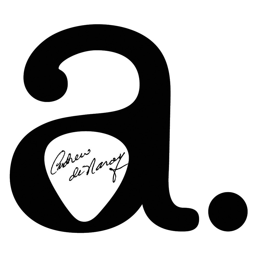 Andrew Denary is a writer and musician, a guitar player to be exact. Using a typewriter font and adding a guitar pick says it all.